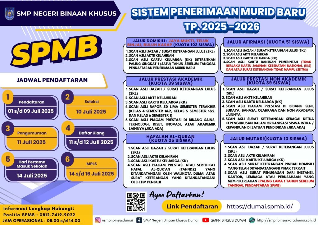 Dumai. Relawannews.com – Sistem Penerimaan Murid Baru .SMPN Binsus Dumai TP.2025 – 2026. Segera Daftarkan Putra Purti Bpk /Ibu di SMPN Binsus Dumai..